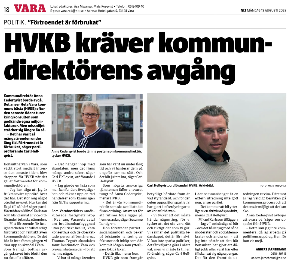Vi i HVKB har, mot bakgrund av de senaste uppgifterna rörande en konsult som projektledare på kommunens fastighetsenhet, meddelat att vårt förtroende för kommundirektören inte längre kvarstår. Det har framkommit flera allvarliga administrativa brister i kommunens hantering. Kommundirektören har aviserat att en extern utredare ska granska ärendet, med beräknat färdigställande i november. Trots detta har kommundirektören uttryckt fortsatt förtroende för sin tjänsteorganisation, även i ljuset av dessa brister.