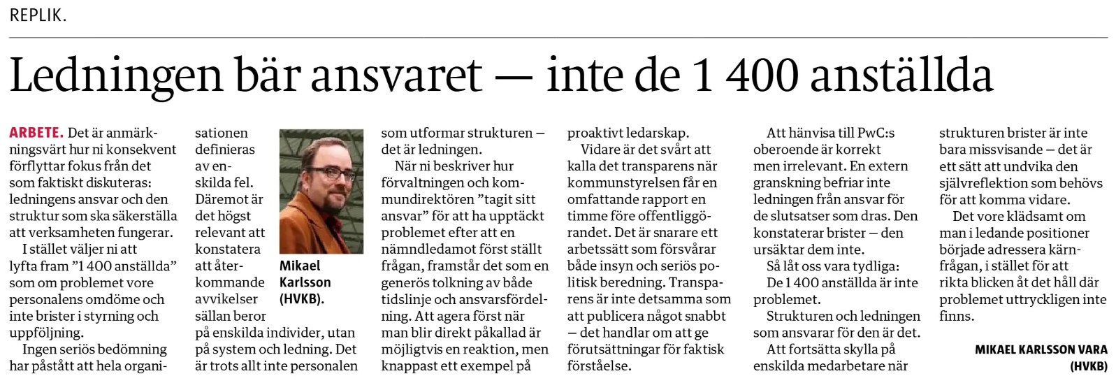 I stället väljer ni att lyfta fram ”1 400 anställda” som om problemet vore personalens omdöme och inte brister i styrning och uppföljning.