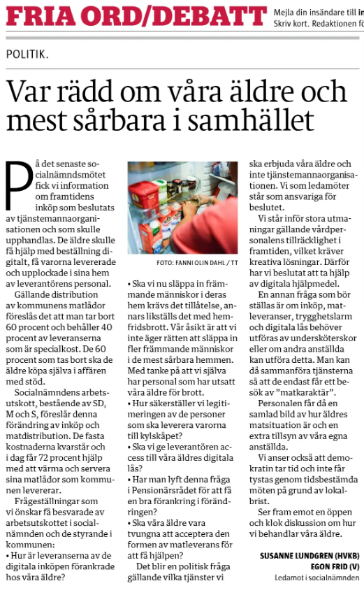 Frågeställningar som vi önskar få besvarade av arbetsutskottet i socialnämnden och de styrande i kommunen. Hur är leveranserna av de digitala inköpen förankrade hos våra äldre? Ska vi nu släppa in främmande människor i deras hem krävs det tillåtelse annars likställs det med hemfridsbrott. Vår åsikt är att vi inte äger rätten att släppa in fler främmande människor i de mest sårbara hemmen. Med tanke på att vi själva har personal som har utsatt våra äldre för brott. Hur säkerställer vi legitimeringen av de personer som ska leverera varorna till kylskåpet? Ska vi ge leverantören access till våra äldres digitala lås? Har man lyft denna fråga i Pensionärsrådet för att få en bra förankring i förändringen? Ska våra äldre vara tvungna att acceptera den formen av matleverans för att få hjälpen?